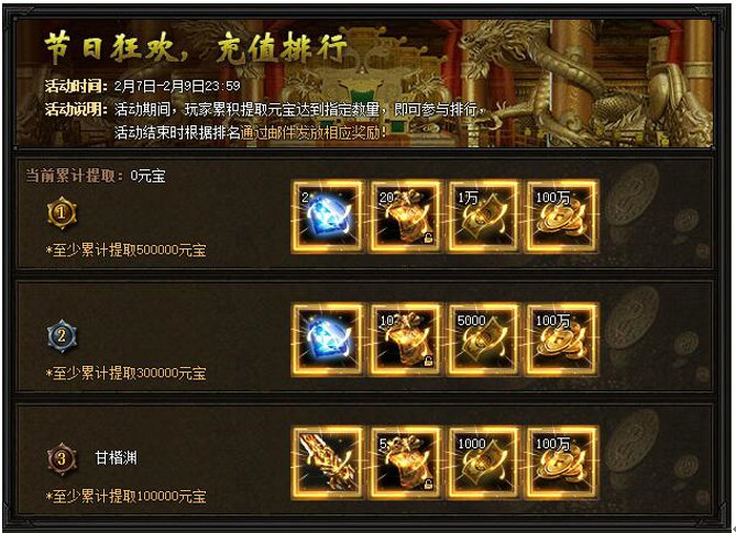 【活动内容】活动期间,累计充值达到指定金额即可参与排行,活动结束后,排名前三的玩家可获得超值排行大奖!