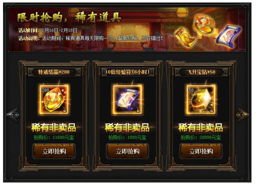 【活动内容】活动期间,稀有道具每天限购一次,超低价格,不容错过!