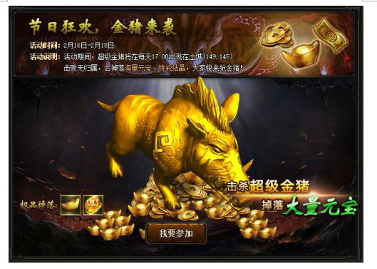 【活动内容】活动期间,超级金猪将在每天17:00出现在土城(149.145),击杀超级金猪将会掉落海量元宝、礼券、特戒结晶,大家快来抢金猪!(注:超级金猪掉落无归属)