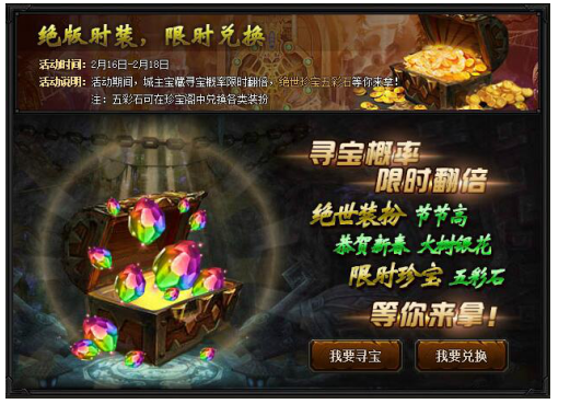 【活动内容】活动期间,城主宝藏寻宝概率限时翻倍,绝世珍宝五彩石等你来拿!
