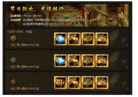 【活动内容】活动期间,累计提取元宝达到指定金额,即可参与排行。
