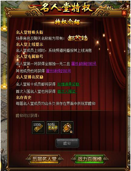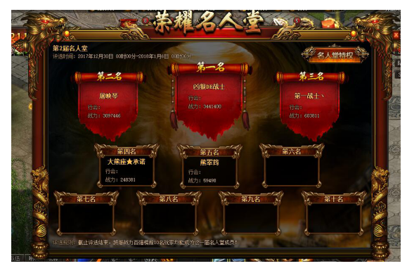【活动内容】活动期间,本平台全服范围内战力前十的玩家信息将展示在活动界面中,供全服玩家瞻仰!
