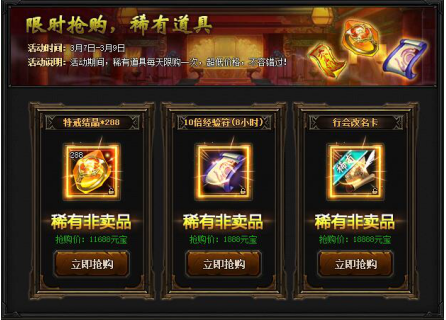 【活动内容】活动期间,稀有道具每天限购一次,超低价格,不容错过!