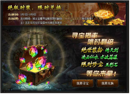 【活动内容】活动期间,城主宝藏寻宝概率限时翻倍,绝世珍宝五彩石等你来拿!