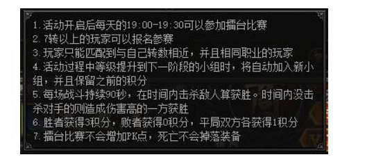 荣耀擂台活动为期3天,每天19:00-19:30开启,所有等级大于等于7转的玩家都可以报名参与。活动按等级分为7-9转、10-12转、13-15转、16-20转四个小组,每个小组根据玩家等级在小组内匹配相同职业的其他玩家进行1V1对战,根据胜负平的结果获得不同积分,按积分进行排名。