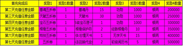 首充礼包:7星武器*1、五折券*1、高级机缘令*1、银两*10w、修为*2w、3级宝石匣子*3、洗炼锁*10、开孔钻*2
