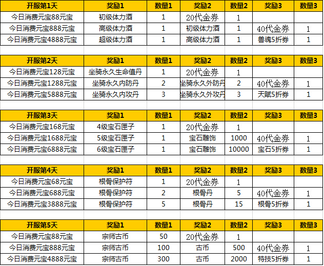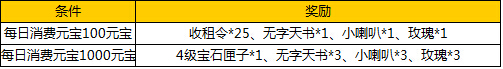 【活动内容】:每日元宝消费返还好礼!单天各个额度的奖励只能领取一次,不可重复,第二天重置奖励。(注意:玩家市场交易元宝和雇佣花费的元宝不计入内)