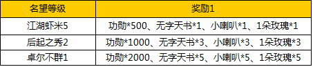 【活动内容】活动期间,玩家升级侠名到一定等级即可获得丰厚奖励。(温馨提示:参与武林大会可获得大量名望奖励,名望用于升级侠名。)