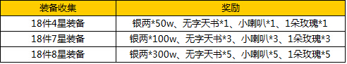 【活动内容】活动期间,玩家只需收集一定数量的不同品质的装备即可获得丰厚奖励。(温馨提示:活动只统计出战角色身上装备的。)