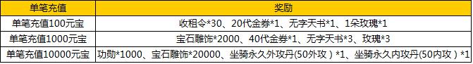 【活动内容】:单笔充值元宝数满足以下条件,即可获得丰厚返利大礼!多充多送,次数不限!为了最大化保证玩家利益,系统将自动判断玩家充值金额,最大程度 给予玩家奖励。例如,玩家单笔充值500元宝,则系统给玩家5份100元宝档的奖励,假如玩家单笔充值2200元宝,则系统给玩家2份1000元宝档+2 份100元宝档的奖励。假如玩家单笔充值12200元宝,则可以领取1份10000元宝档+2份1000元宝档+2份100元宝档的奖励