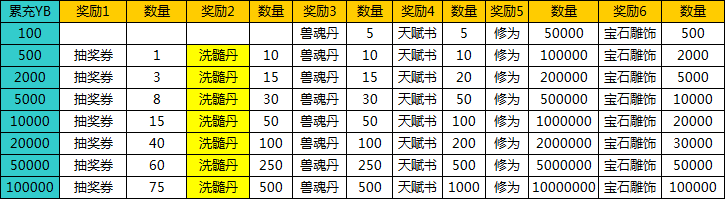 活动内容:活动期间玩家只要充值达到100、500、2000、5000、10000、20000、50000、100000元宝,即时可从面板上领取相应额度的返利奖励!(即假设玩家最终累计充值2000元宝,则一共可领取前3个额度的馈赠)
