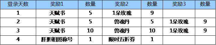 2.需连续登陆4天,才能把全部奖励领取完毕,若中间有中断,则下次登陆从中断的后一天继续领取。