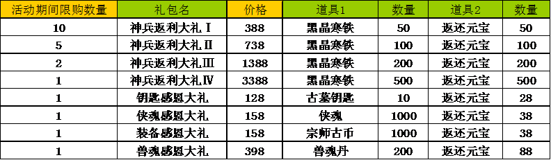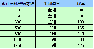 1.活动期间,累计消耗指定数量的神兵经验道具(黑晶寒铁),可领取物品奖励。