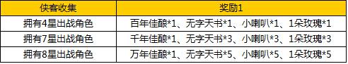 【活动内容】活动期间,玩家只需收集任一对应星级侠客即可获得丰厚奖励。(温馨提示:活动只统计上阵侠客,每个区间只能领取一次奖励。)