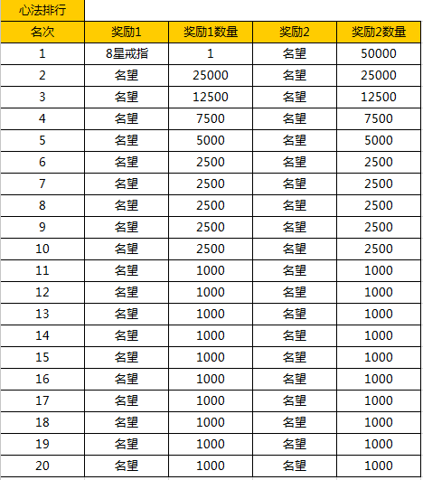 1、活动期间,上阵角色心法总战力排行第一可获得8星戒指*1,前20名玩家均可获得名望奖励。
