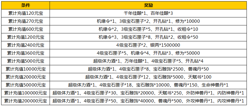 【活动内容】:开服前7天,累计充值元宝满足以下条件,即可获得丰厚大礼!