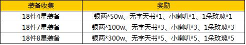 【活动内容】活动期间,玩家只需收集一定数量的不同品质的装备即可获得丰厚奖励。(温馨提示:活动只统计出战角色身上装备的。)