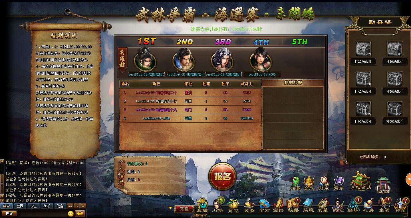 1、每周1、2、3晚上20点整至20点30分进行海选赛,各参赛选手可在该时间段内可以自由报名参加战斗