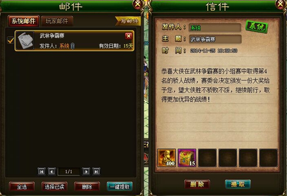 8、武林争霸的每一场战斗后均可以获得相应赛事的战斗奖励
