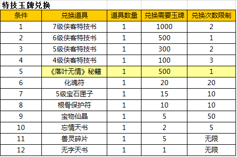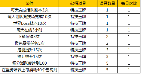 活动内容:群雄特技,烽火战连天!活动期间,每天完成相应的活动内容即可获得对应数量的特技玉牌。特技玉牌可兑换高级技能书!