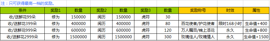 1、累积赠送或收到对应数量玫瑰,获得称号奖励。玩家只能获得最高区间的奖励。