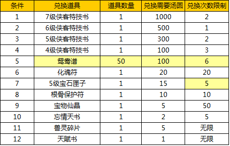 活动规则:活动期间,只要您消耗相应数量的活动道具,即可兑换以下奖励(侠侣技能必需道具——鸳鸯谱大量兑换。)