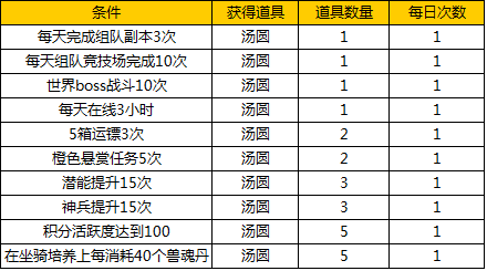 活动内容:活动期间,每天完成相应的活动内容即可获得对应数量的汤圆。汤圆可兑换高级技能书和鸳鸯谱!