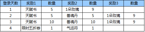 2.需连续登陆4天,才能把全部奖励领取完毕,若中间有中断,则下次登陆从中断的后一天继续领取。
