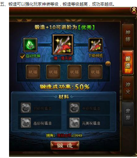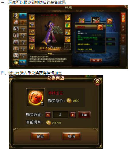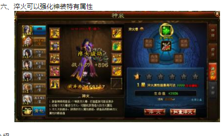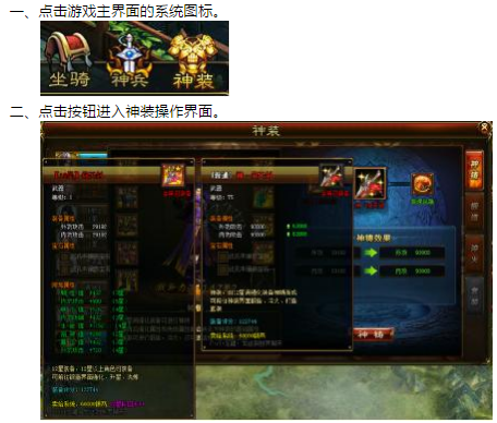 现有装备系统的晋级类型,给玩家更多的成长空间。神装主要分为三块:神装锻造,神装淬火,神装套装。