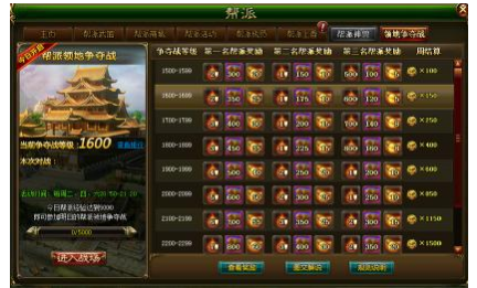 13)争夺战结束后,会根据参与帮派获得的积分进行排名,根据排名的不同发放相应奖励,只有个人积分达到300及其以上帮派成员才能获得奖励,奖励通过邮件获得