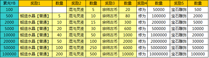 活动内容:活动期间玩家只要充值达到100、500、2000、5000、10000、20000、50000、100000元宝,即时可从面板上领取相应额度的返利奖励!(即假设玩家最终累计充值2000元宝,则一共可领取前3个额度的馈赠)