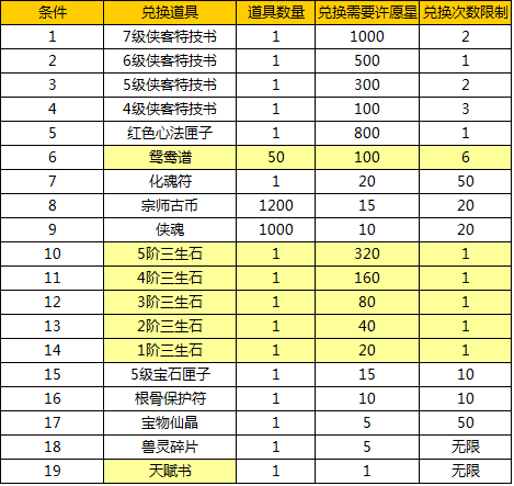 活动内容:活动期间,每天完成相应的活动内容即可获得对应数量的许愿星。许愿星可兑换高级技能书和鸳鸯谱!