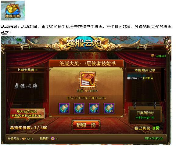 8.抽奖机会只能通过充值元宝和抢购券购买(优先消耗抢购券)