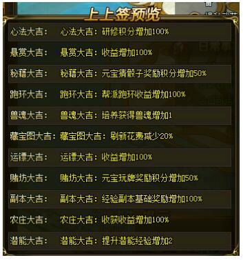 活动内容:活动期间开启吉日活动开启buff加成,参与buff加成的系统有:运镖,悬赏,副本,农庄,跑环,兽魂,潜能,藏宝图,心法,赌坊,秘籍等系统,不同签文buff加成不同,玩家可通过改签获得高buff加成的签文。