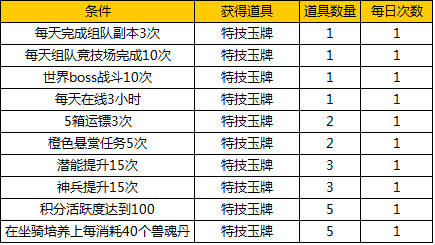 活动内容:群雄特技,烽火战连天!活动期间,每天完成相应的活动内容即可获得对应数量的特技玉牌。特技玉牌可兑换高级技能书!
