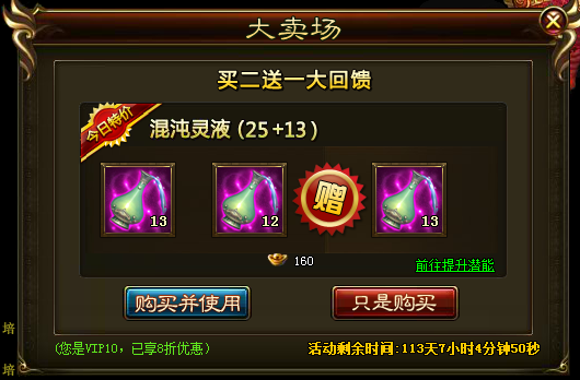 活动内容:活动期间推出混沌灵液特价,并且买二十五送十三的馈赠活动。