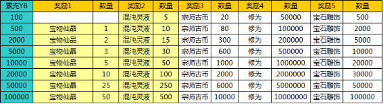 活动内容:活动期间玩家只要充值达到100、500、2000、5000、10000、20000、50000、100000元宝,即时可从面板上领取相应额度的返利奖励!(即假设玩家最终累计充值2000元宝,则一共可领取前3个额度的馈赠)