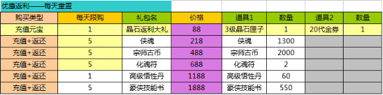 2.每笔充值都可以获得100%数额的返还元宝,每日返还上限为5000返还元宝。