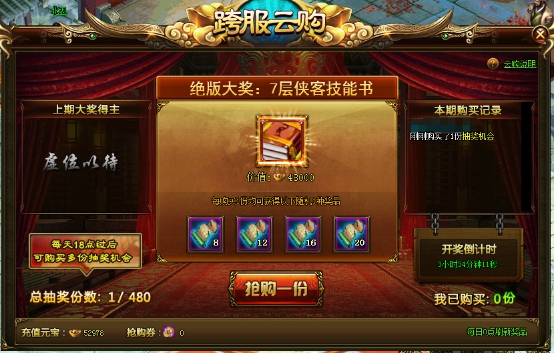 8.抽奖机会只能通过充值元宝和抢购券购买(优先消耗抢购券)