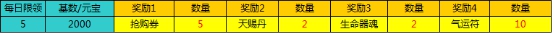活动期间,只要每累积充值2000元宝即可领取一次奖励,每日最高领取5次。