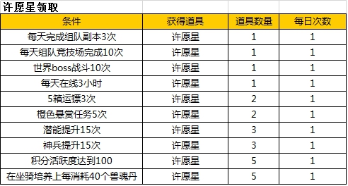 活动内容:活动期间,每天完成相应的活动内容即可获得对应数量的许愿星。许愿星可兑换珍稀道具!