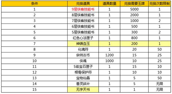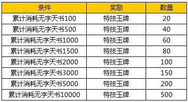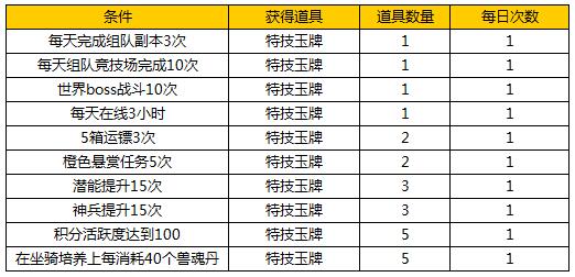 活动内容:群雄特技,烽火战连天!活动期间,每天完成相应的活动内容即可获得对应数量的特技玉牌。特技玉牌可兑换高级技能书!