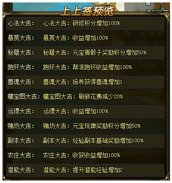 活动内容:活动期间开启吉日活动开启buff加成,参与buff加成的系统有:运镖,悬赏,副本,农庄,跑环,兽魂,潜能,藏宝图,心法,赌坊,秘籍等系统,不同签文buff加成不同,玩家可通过改签获得高buff加成的签文。