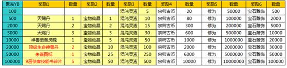 活动内容:活动期间玩家只要充值达到100、500、2000、5000、10000、20000、50000、100000元宝,即时可从面板上领取相应额度的返利奖励!(即假设玩家最终累计充值2000元宝,则一共可领取前3个额度的馈赠)