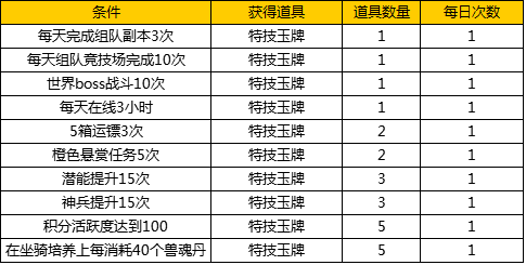 活动内容:活动期间,每天完成相应的活动内容即可获得对应数量的特技玉牌。特技玉牌可兑换珍稀道具!