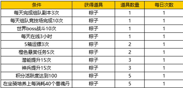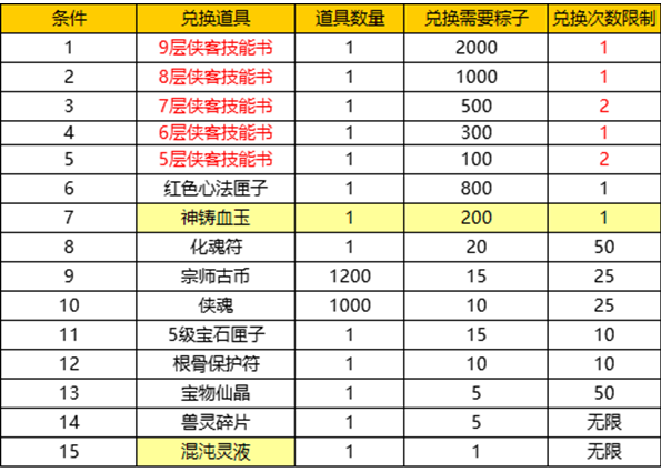 活动内容:群雄特技,烽火战连天!活动期间,每天完成相应的活动内容即可获得对应数量的粽子。粽子可兑换高级技能书!