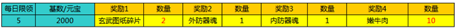 活动期间,只要每累积充值2000元宝即可领取一次奖励,每日最高领取5次。