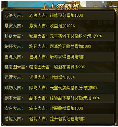 活动内容:活动期间开启吉日活动开启buff加成,参与buff加成的系统有:运镖,悬赏,副本,农庄,跑环,兽魂,潜能,藏宝图,心法,赌坊,秘籍等系统,不同签文buff加成不同,玩家可通过改签获得高buff加成的签文。