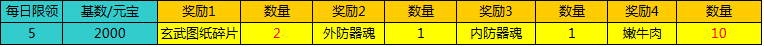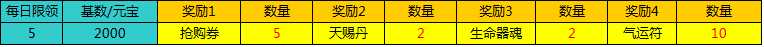 活动期间,只要每累积充值2000元宝即可领取一次奖励,每日最高领取5次。