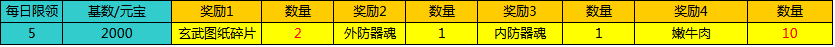 活动期间,只要每累积充值2000元宝即可领取一次奖励,每日最高领取5次。
